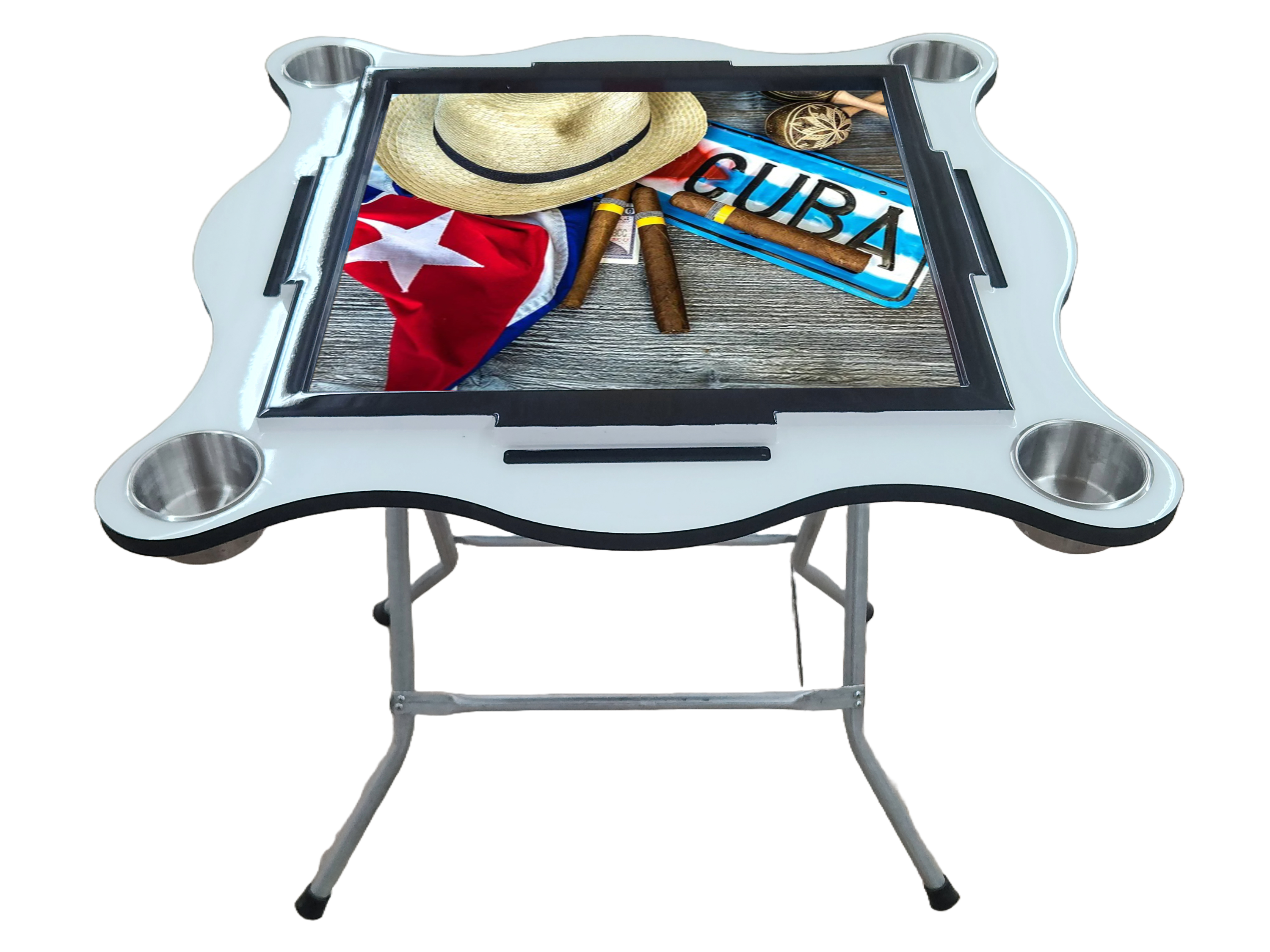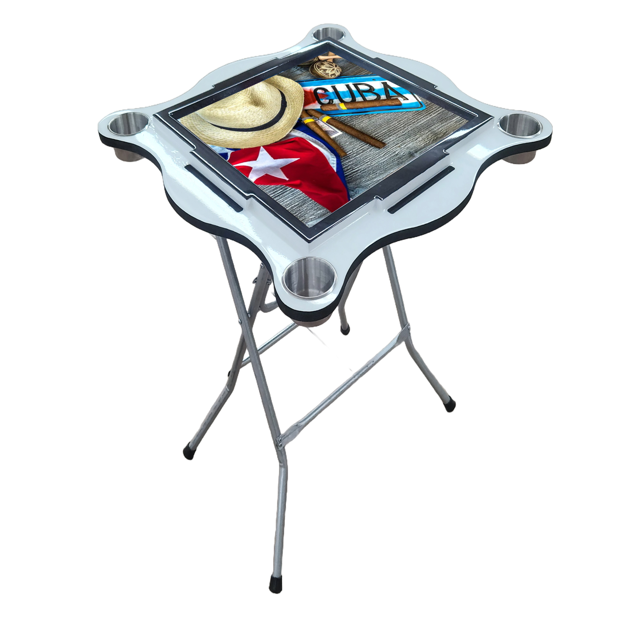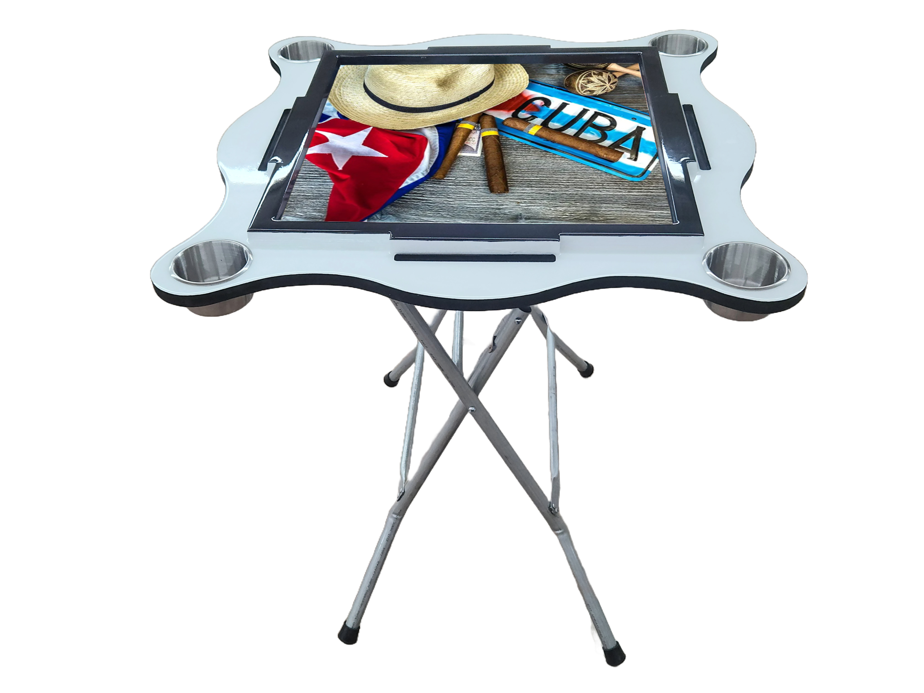 “Introducing our Domino Table, a perfect blend of style and functionality. Measuring 32 x 32 inches with a comfortable height of 30 inches, this table is designed for the ultimate gaming experience. It boasts an exquisite epoxy resin top, ensuring durability and a sleek finish. Accommodating up to 8 domino tiles for regular play and up to 11 for the Cuban variant, every player can comfortably tuck their legs under the table thanks to its ergonomically designed legs. Easy to set up and fold away, this table is crafted from 3/4-inch plywood, promising robustness. Available in various colors to suit your preference.”