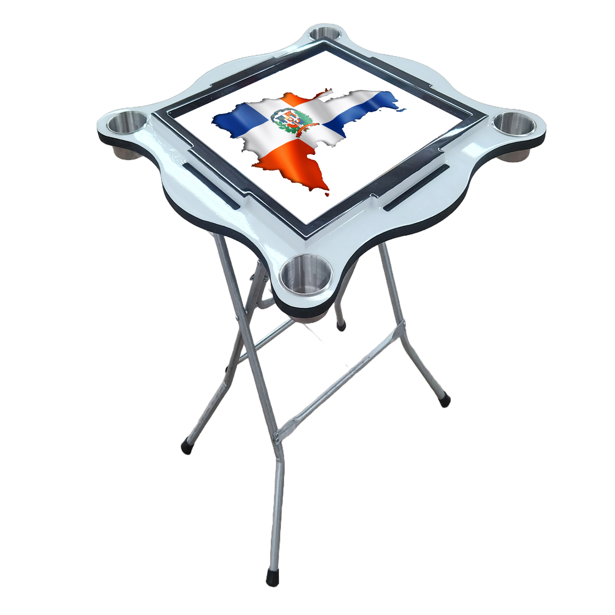 “Introducing our Domino Table, a perfect blend of style and functionality. Measuring 32 x 32 inches with a comfortable height of 30 inches, this table is designed for the ultimate gaming experience. It boasts an exquisite epoxy resin top, ensuring durability and a sleek finish. Accommodating up to 8 domino tiles for regular play and up to 11 for the Cuban variant, every player can comfortably tuck their legs under the table thanks to its ergonomically designed legs. Easy to set up and fold away, this table is crafted from 3/4-inch plywood, promising robustness. Available in various colors to suit your preference.”