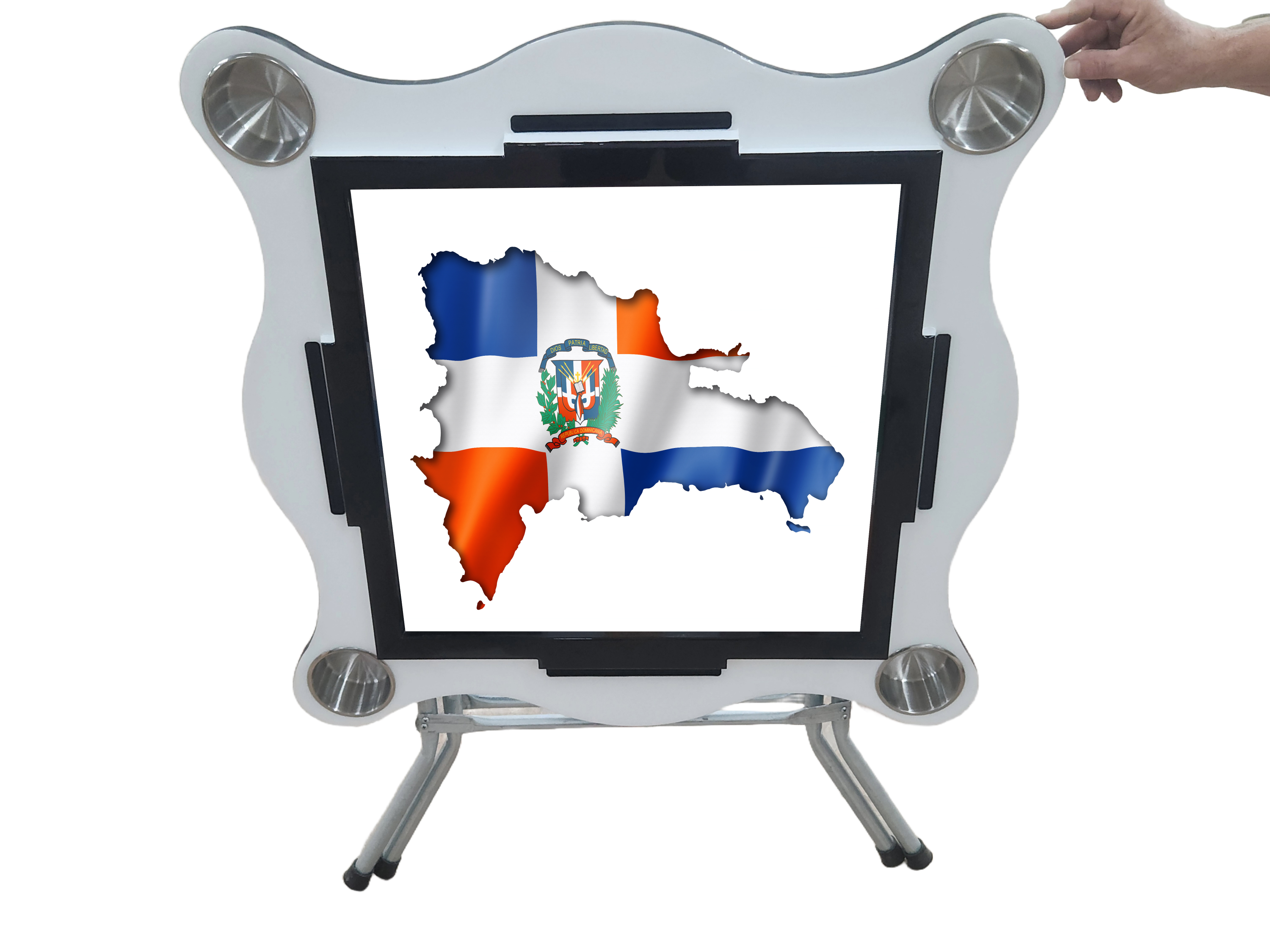 • Colores Vibrantes: Resalta los colores característicos rojo, azul y blanco de la bandera dominicana, con un acabado brillante que llama la atención.